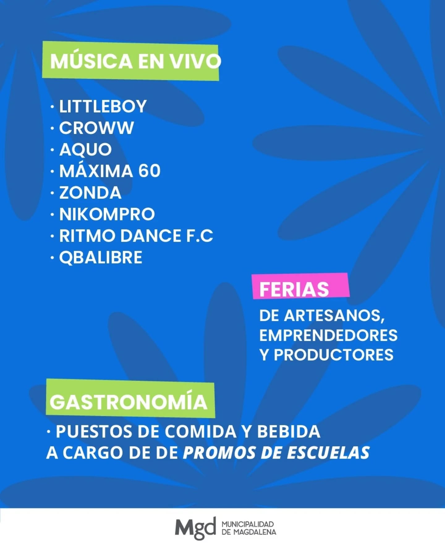 Vení a disfrutar una tarde llena de música en vivo con artistas locales, feria de artesanos, emprendedores y productores, y puestos de comida y bebida a cargo de las promos de nuestras escuelas. 🌞🎶