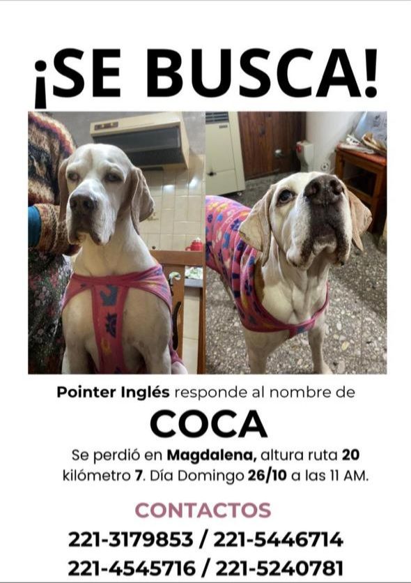 Es una pointer inglés y responde al nombre de Coca. Se perdió el domingo 26 de octubre alrededor de las 11:00 hs por Ruta 20 Km 7.