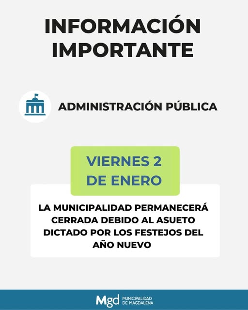 Informamos a la comunidad que el viernes 2 de enero la Municipalidad permanecerá cerrada, en el marco del asueto por las celebraciones de Año Nuevo.