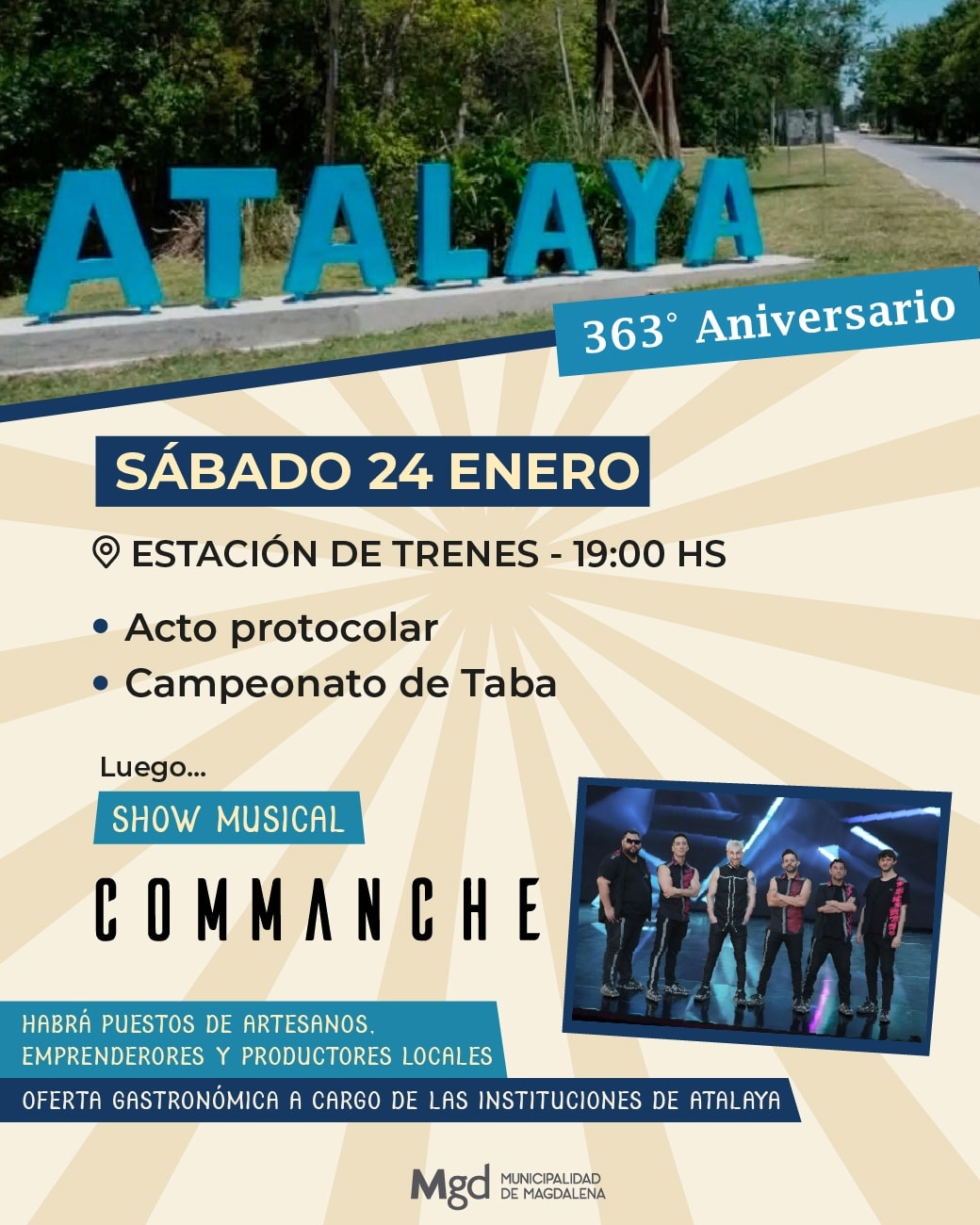 🛍️🎶 Además, vas a poder recorrer puestos de artesanos, emprendedores y productores locales, acompañados de buena música y el mejor clima para festejar juntos un nuevo aniversario de nuestra querida Atalaya.