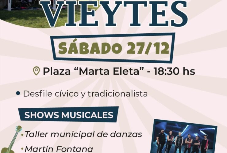 Este sábado 27 de diciembre, celebramos juntos el 133° aniversario de Vieytes con una jornada para disfrutar en comunidad. Plaza “Marta Eleta” Desde las 18:30 hs Viviremos un desfile cívico y tradicionalista, espectáculos y música en vivo con el Taller ...