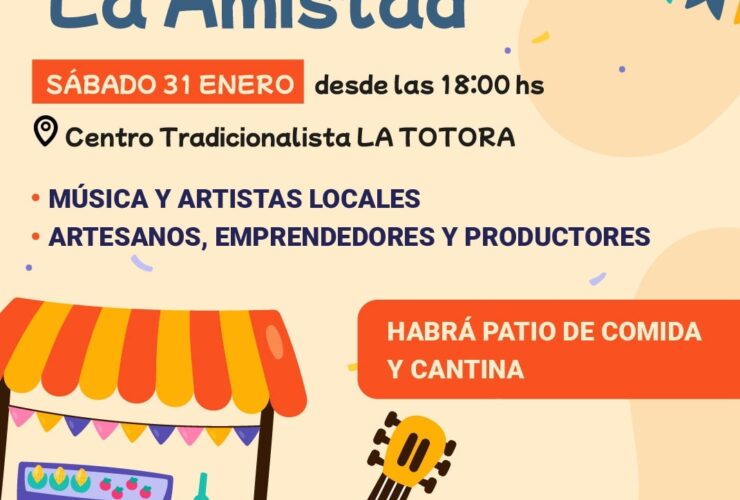 Este sábado 31 de enero, desde las 18:00 hs, te esperamos en el Centro Tradicionalista La Totora para disfrutar de la Feria de la Amistad Música y artistas locales Artesanos, emprendedores y productores Patio de comidas y cantina Una propuesta ...