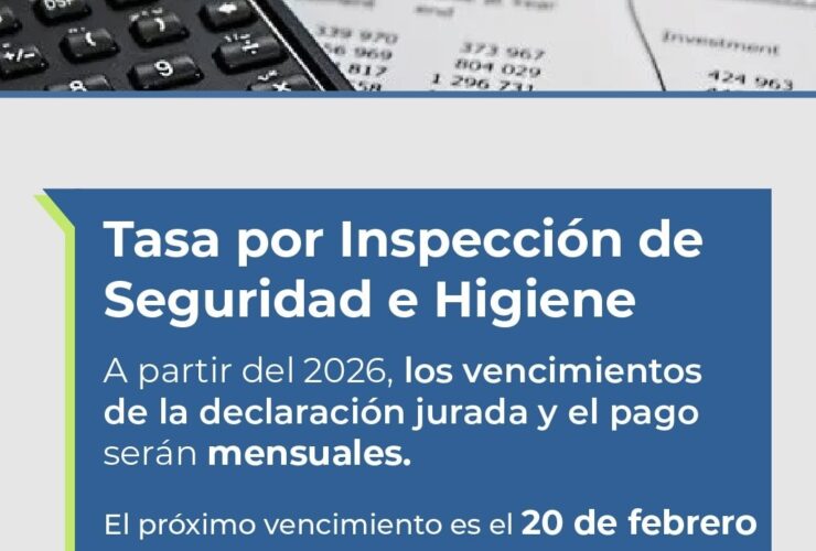 A partir de 2026, la Tasa por Inspección de Seguridad e Higiene tendrá vencimientos mensuales, tanto para la presentación de la declaración jurada como para el pago. El próximo vencimiento será el 20 de febrero. Ante cualquier consulta presentarse en ...